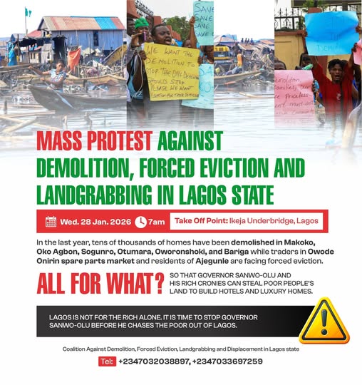 PROTESTERS STORM LAGOS STATE HOUSE OF ASSEMBLY ALAUSA, DEMANDING IMMEDIATE STOPPAGE OF DEMOLITION OF MAKOKO WATERFRONT AND ADEQUATE COMPENSATION FOR VICTIMS Makoko residents stormed the Lagos State House of Assembly, Alausa, Ikeja for a two-day protest between Thursday January 15 and Friday January 16, 2026, demanding an end to the ongoing demolition of houses in their community and adequate compensation for